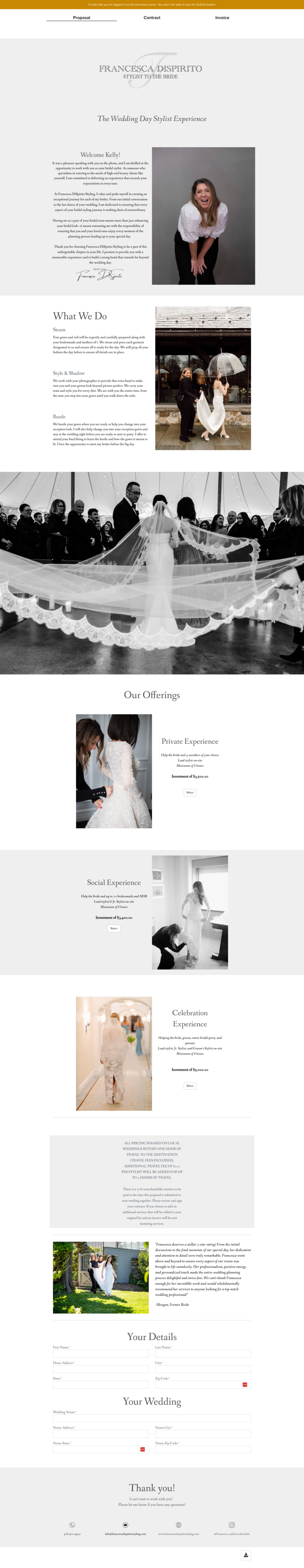 Her clients can now inquire through her website and get an automated response, knowing what to expect from her. She then checks her availability before inviting them to book a consultation with her. Her clients get reminders about their appointments and afterward, receive a beautiful proposal to book her services. Her proposal will automatically create their customized contract and invoice so she can spend time focusing on their styling and look, not admin tasks!
