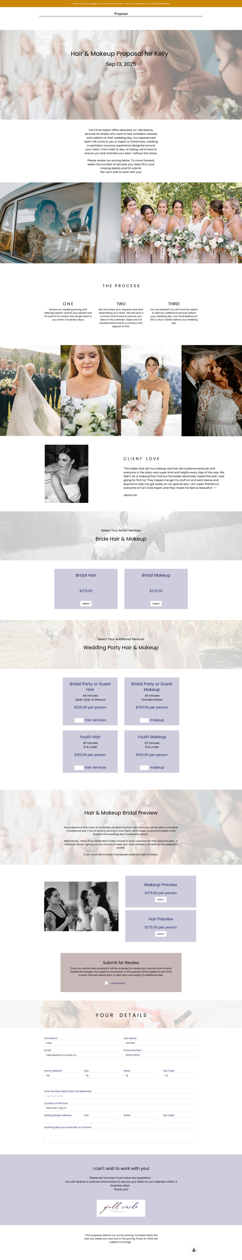 Before working together, Emely was managing her bridal beauty bookings with a mix of Squarespace forms, Google Sheets, Vagaro, and email threads. As the new owner of Full Circle Aspen, she knew it was time to streamline. With destination brides expecting a seamless experience, she wanted a more professional, organized, and personalized system to match the level of service she provides.