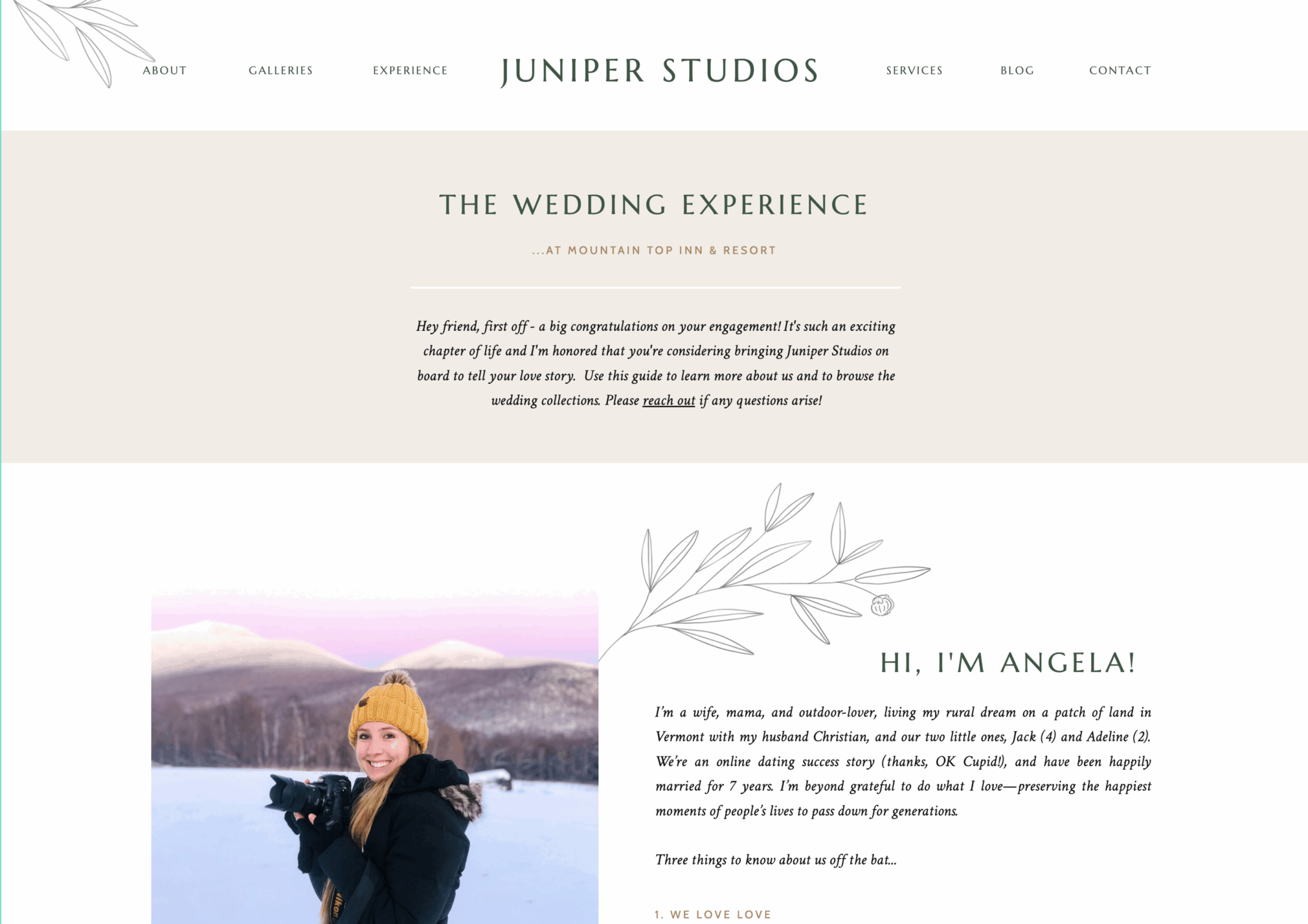 Another client, Angela, was using a hidden Showit page as her proposal. While beautiful, it was time consuming to recreate contracts and invoices for each client that wanted to book. We used Dubsado’s native elements and CSS to incorporate her custom fonts into the design. Below is an example of her Showit booking page…